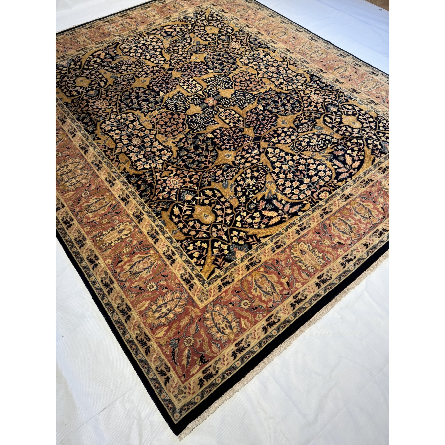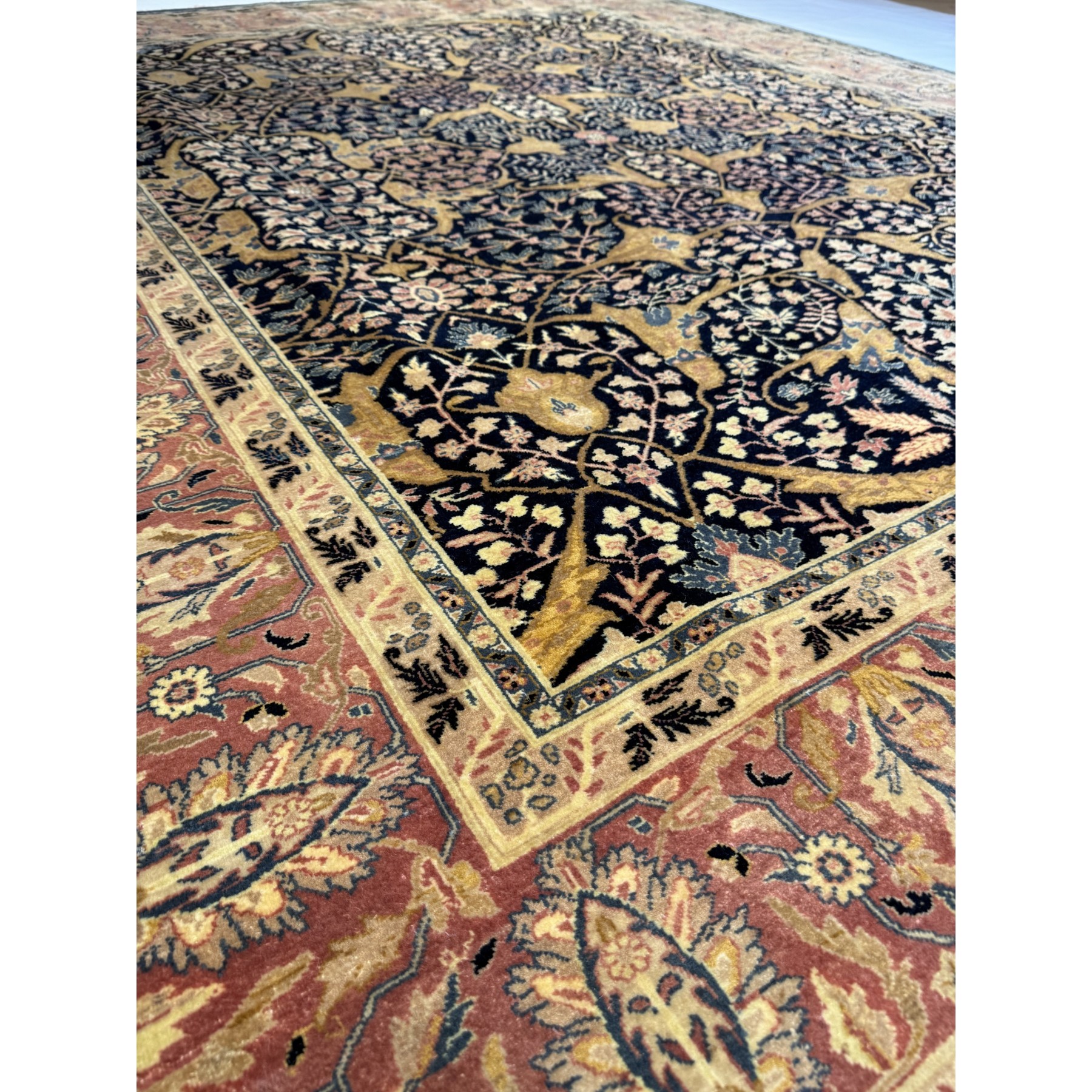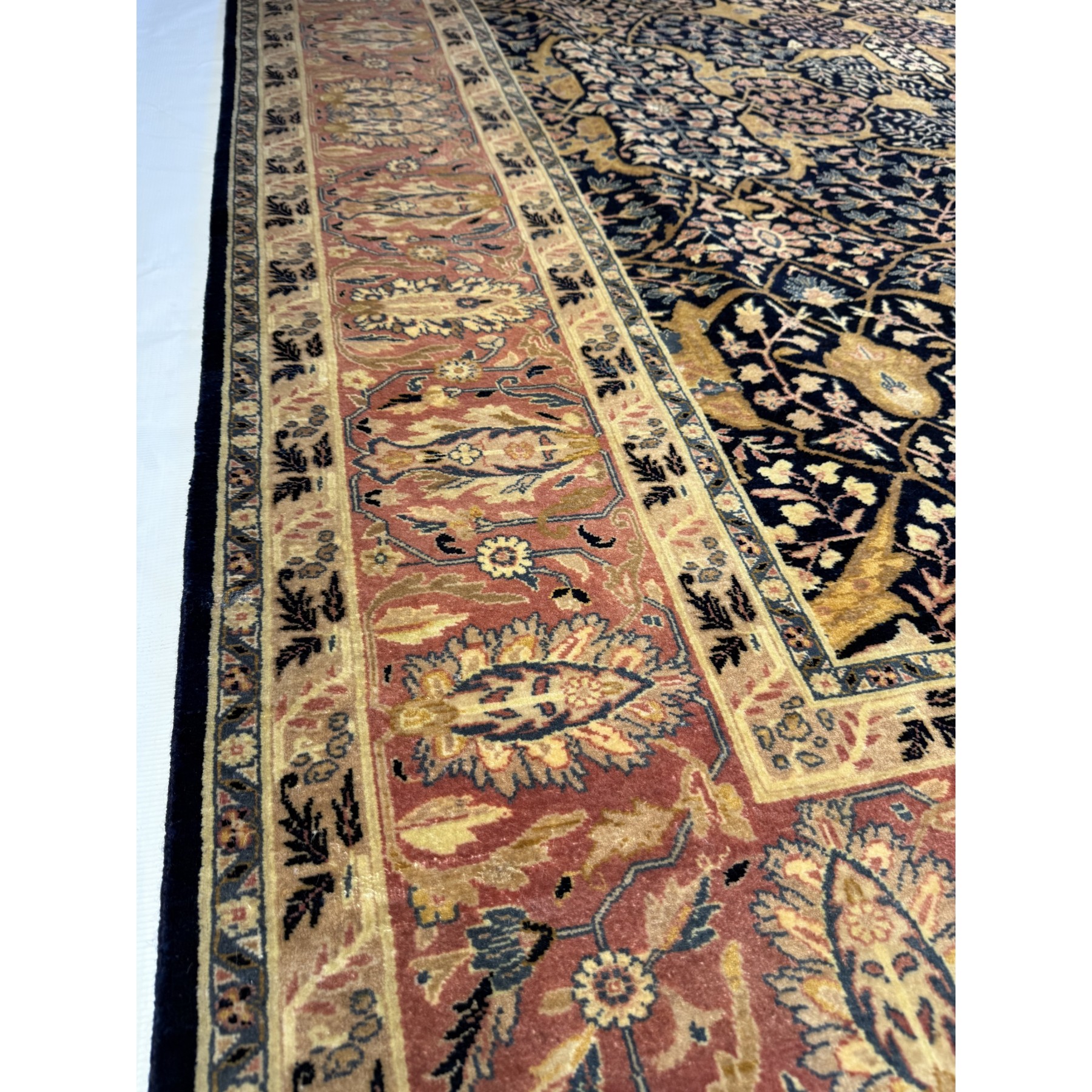 Ten Afgański Tabriz Jalili to prawdziwe arcydzieło sztuki tkackiej. Wykonany ręcznie z najwyższej jakości wełny, charakteryzuje się niespotykaną gęstością tkania, co czyni go jednym z najbardziej luksusowych dywanów dostępnych na rynku. Bogaty ornament inspirowany klasycznymi wzorami perskimi wypełniają motywy roślinne, tworząc harmonijną i elegancką kompozycję. Złote i granatowe tło kontrastuje z bordiurą w odcieniach czerwieni, co nadaje dywanowi majestatyczny charakter. To wybór dla koneserów, którzy poszukują wyjątkowej jakości i ponadczasowego piękna do swoich wnętrz.
