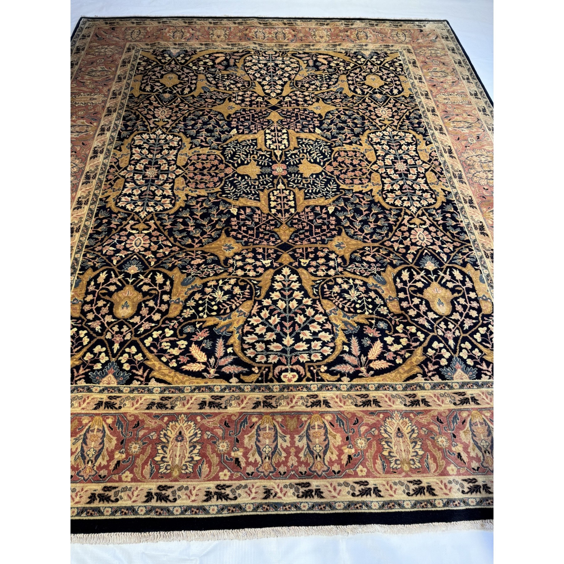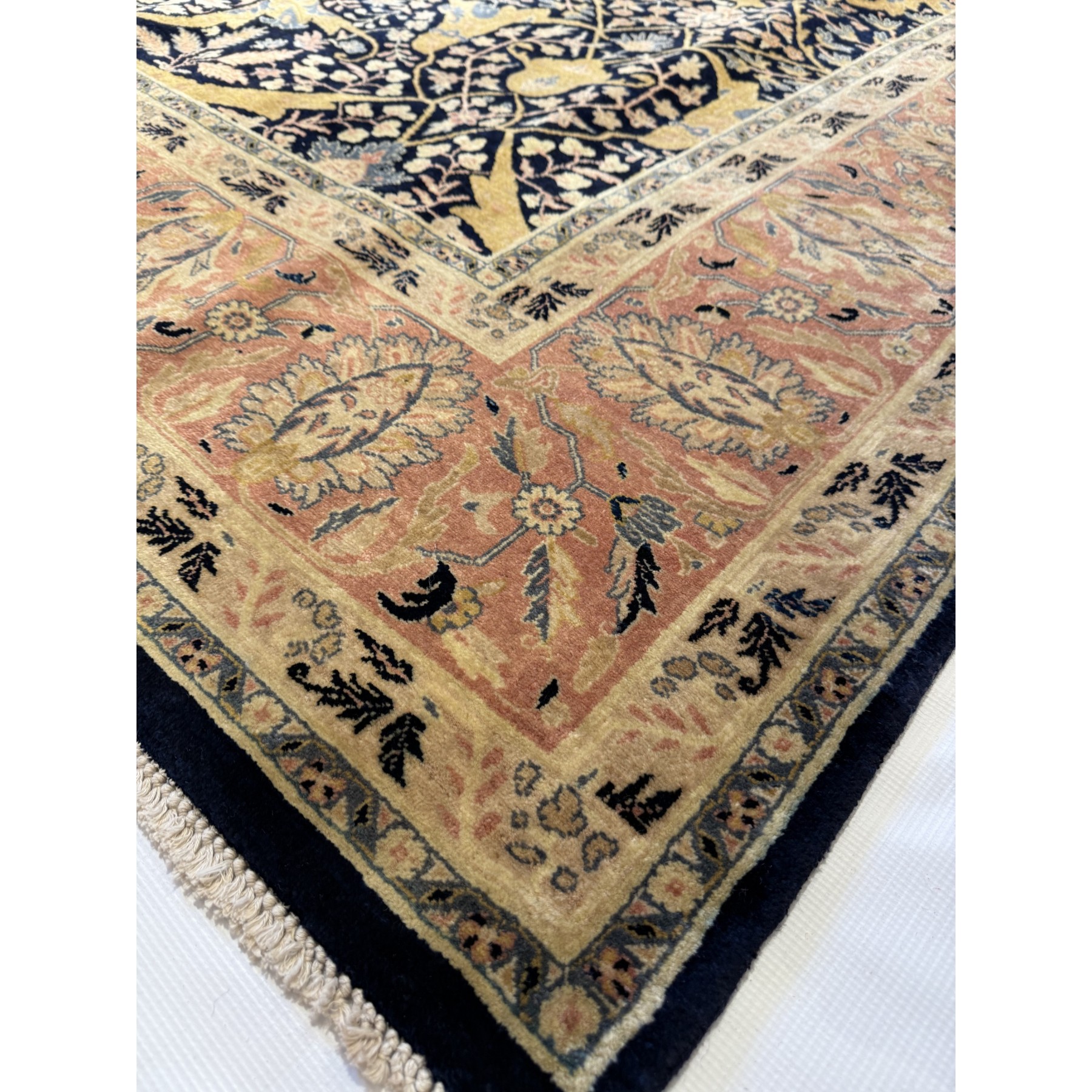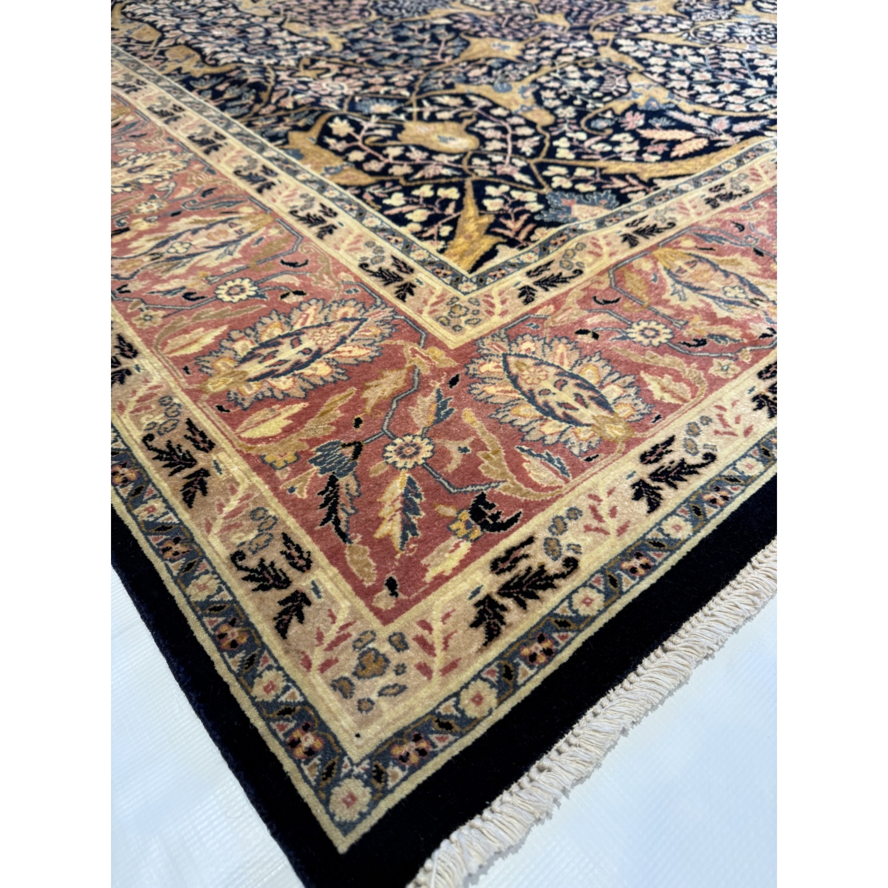 Ten Afgański Tabriz Jalili to prawdziwe arcydzieło sztuki tkackiej. Wykonany ręcznie z najwyższej jakości wełny, charakteryzuje się niespotykaną gęstością tkania, co czyni go jednym z najbardziej luksusowych dywanów dostępnych na rynku. Bogaty ornament inspirowany klasycznymi wzorami perskimi wypełniają motywy roślinne, tworząc harmonijną i elegancką kompozycję. Złote i granatowe tło kontrastuje z bordiurą w odcieniach czerwieni, co nadaje dywanowi majestatyczny charakter. To wybór dla koneserów, którzy poszukują wyjątkowej jakości i ponadczasowego piękna do swoich wnętrz.