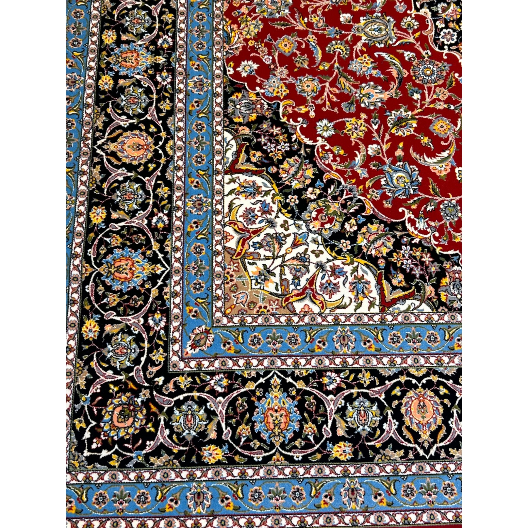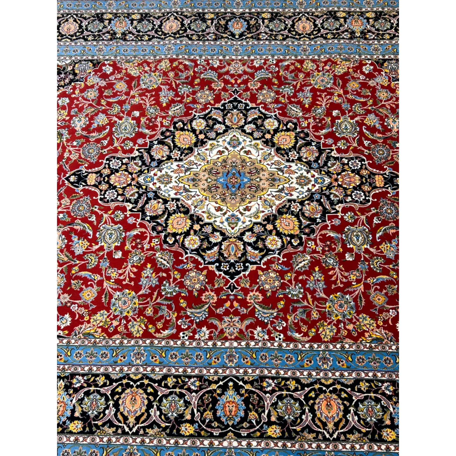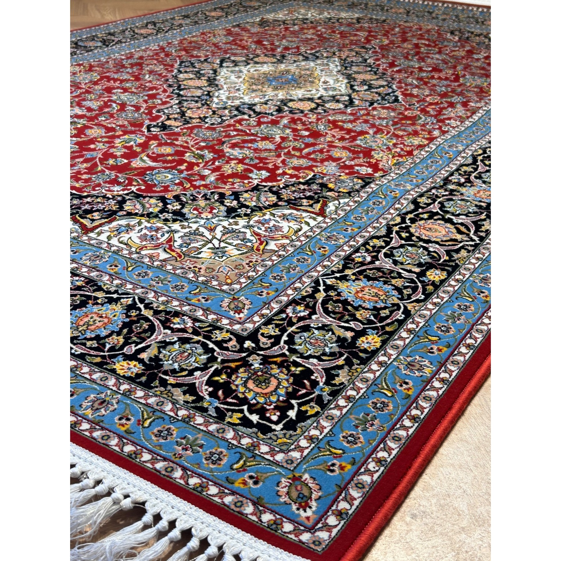 Ten wyjątkowy dywan irański został utkany z wysokiej jakości akrylowej przędzy, która łączy trwałość z miękkością w dotyku. Jego bogaty orientalny wzór w czerwieni, czerni i błękicie nawiązuje do tradycyjnych perskich kobierców, wnosząc do wnętrza luksus i wyrafinowanie. Precyzyjnie wykonane detale sprawiają, że dywan pięknie prezentuje się w salonie czy jadalni, stając się centralnym punktem aranżacji. To idealny wybór dla osób ceniących ponadczasową klasykę.