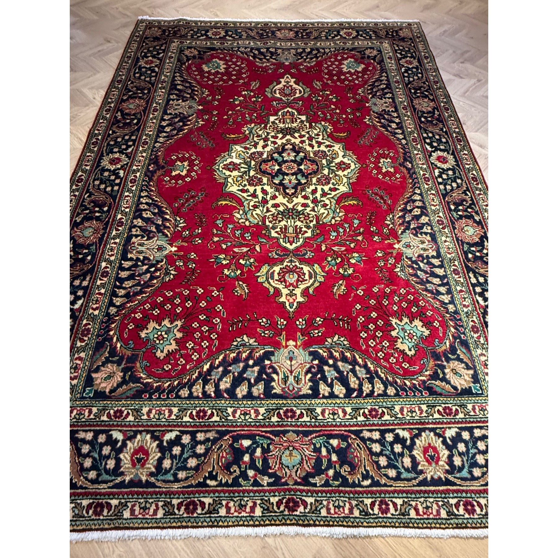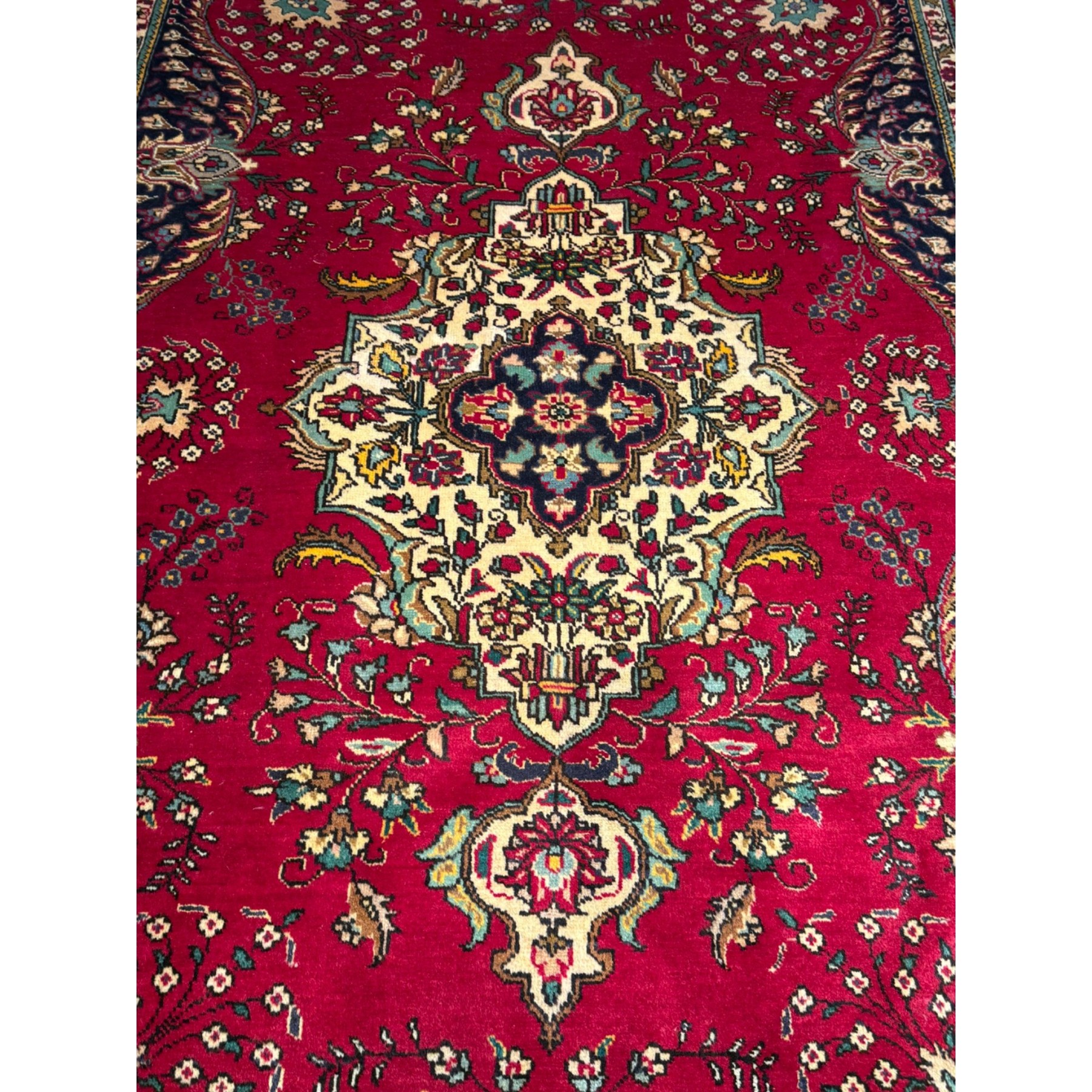 Ten irański, ręcznie tkany dywan Tabriz wykonany z wysokiej jakości wełny prezentuje pełnię kunsztu jednego z najważniejszych ośrodków tkackich Persji. Tabriz od wieków słynie z precyzyjnych, misternych wzorów i gęstego, jedwabistego runa, a dywany powstające w tym mieście uchodzą za jedne z najbardziej dopracowanych na świecie. Na tym egzemplarzu dominuje głęboka, nasycona czerwień, która pięknie podkreśla centralny medalion inspirowany klasycznym perskim wzornictwem. Bogato zdobione bordiury, roślinne ornamenty i harmonijne przejścia kolorów budują elegancki, ponadczasowy charakter dywanu.