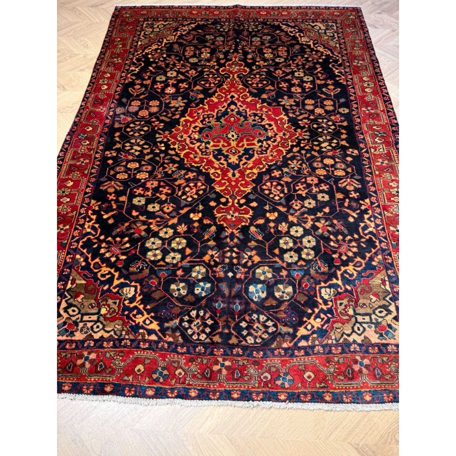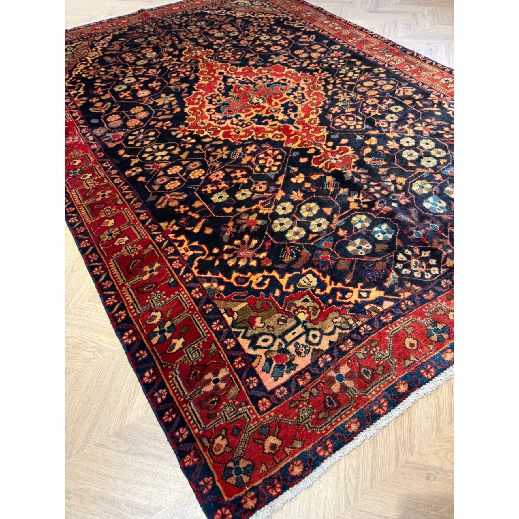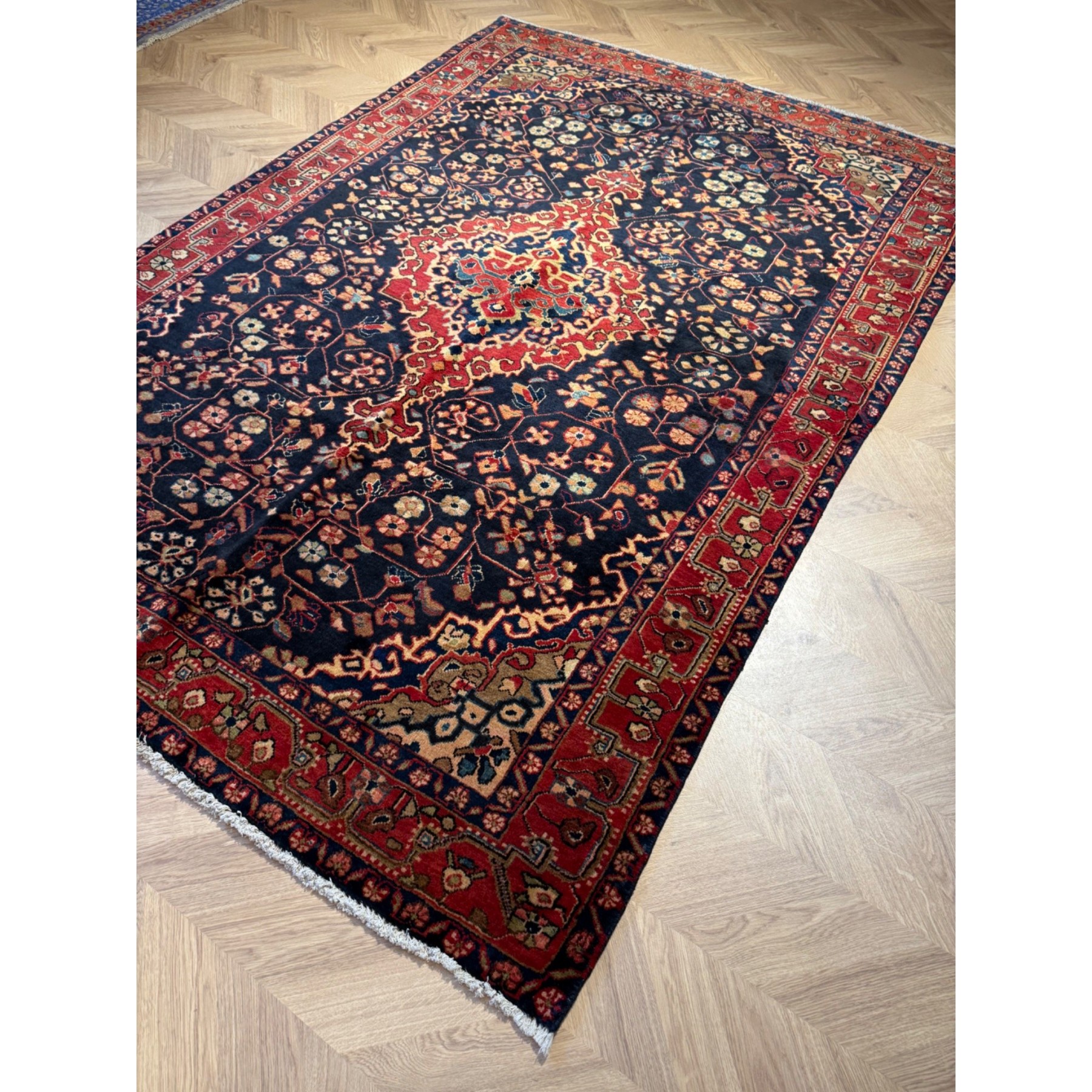 Wzór oparty na centralnym medalionie harmonijnie przechodzi w gęsto rozmieszczone motywy kwiatowe i roślinne, charakterystyczne dla okolicznych wiosek, gdzie od pokoleń przekazywane są te same techniki tkackie. Połączenie głębokiego granatu, czerwieni, ochry i subtelnych akcentów zieleni tworzy dywan o wyjątkowej głębi i elegancji. Bogata bordiura podkreśla jego tradycyjny, perski styl i doskonale zamyka całą kompozycję.