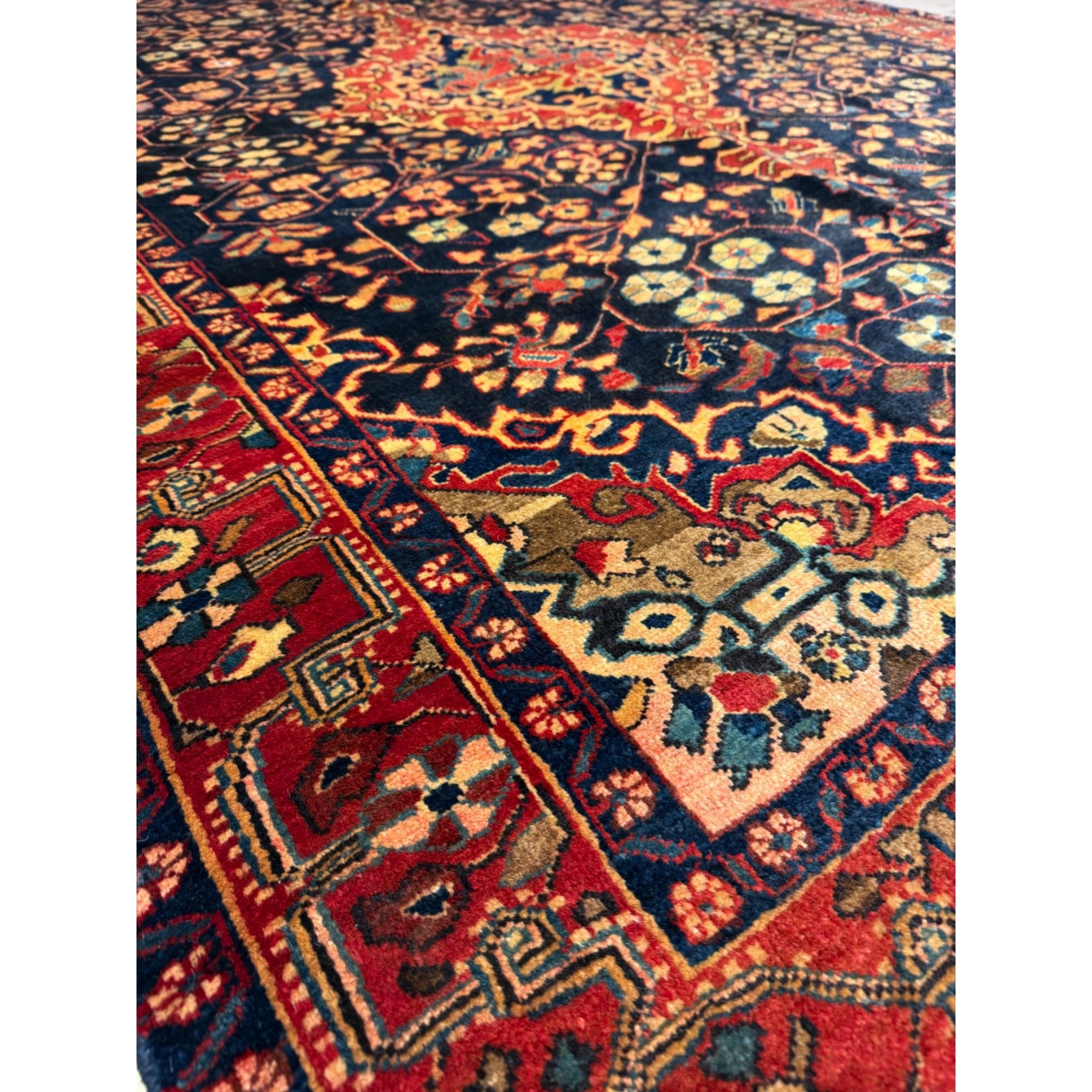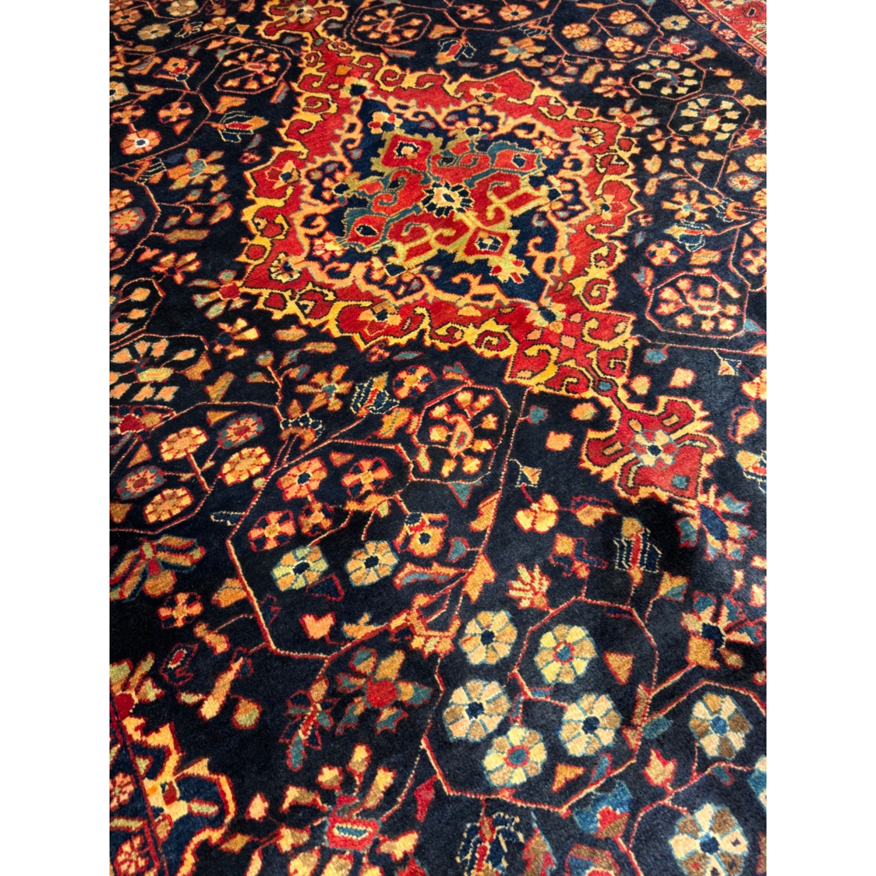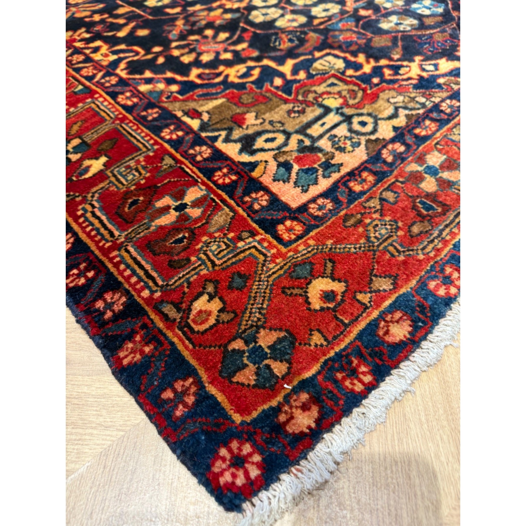Wzór oparty na centralnym medalionie harmonijnie przechodzi w gęsto rozmieszczone motywy kwiatowe i roślinne, charakterystyczne dla okolicznych wiosek, gdzie od pokoleń przekazywane są te same techniki tkackie. Połączenie głębokiego granatu, czerwieni, ochry i subtelnych akcentów zieleni tworzy dywan o wyjątkowej głębi i elegancji. Bogata bordiura podkreśla jego tradycyjny, perski styl i doskonale zamyka całą kompozycję.