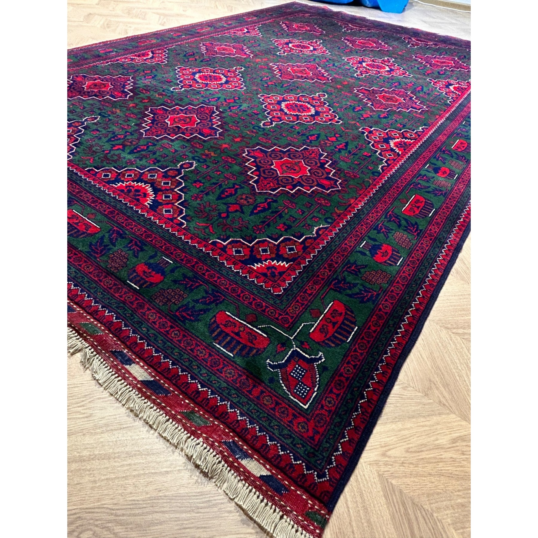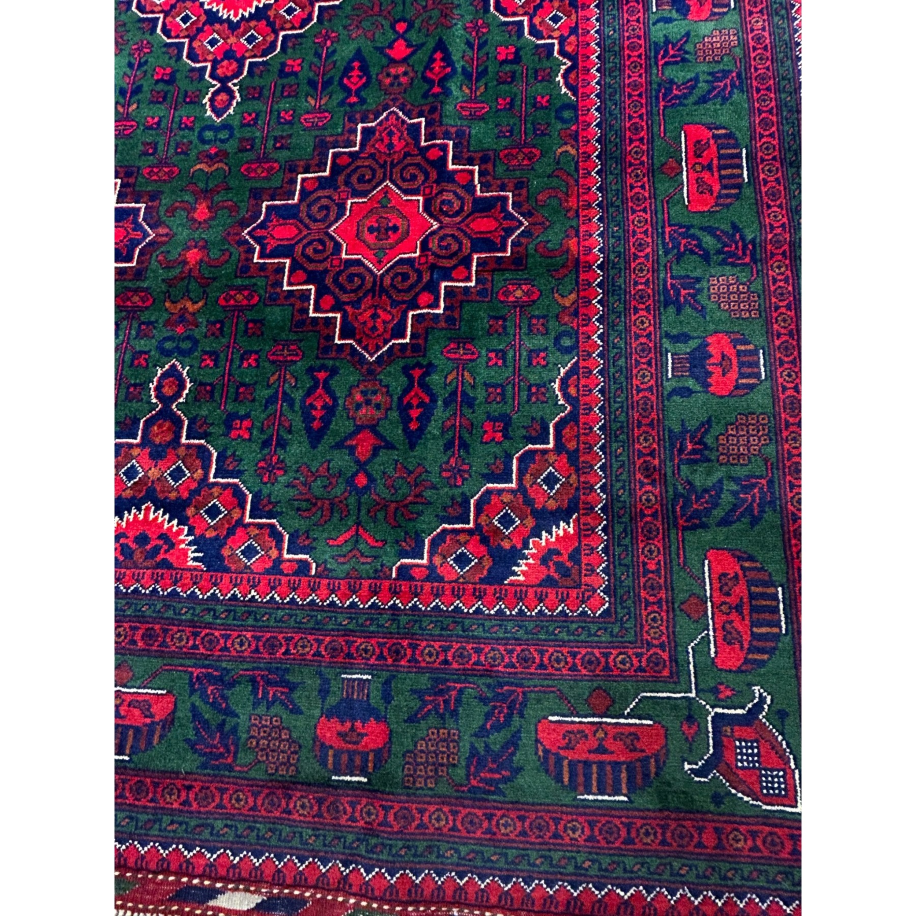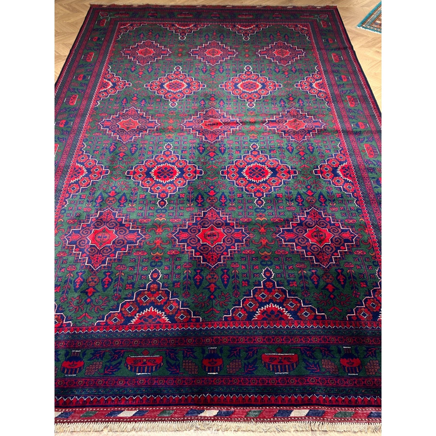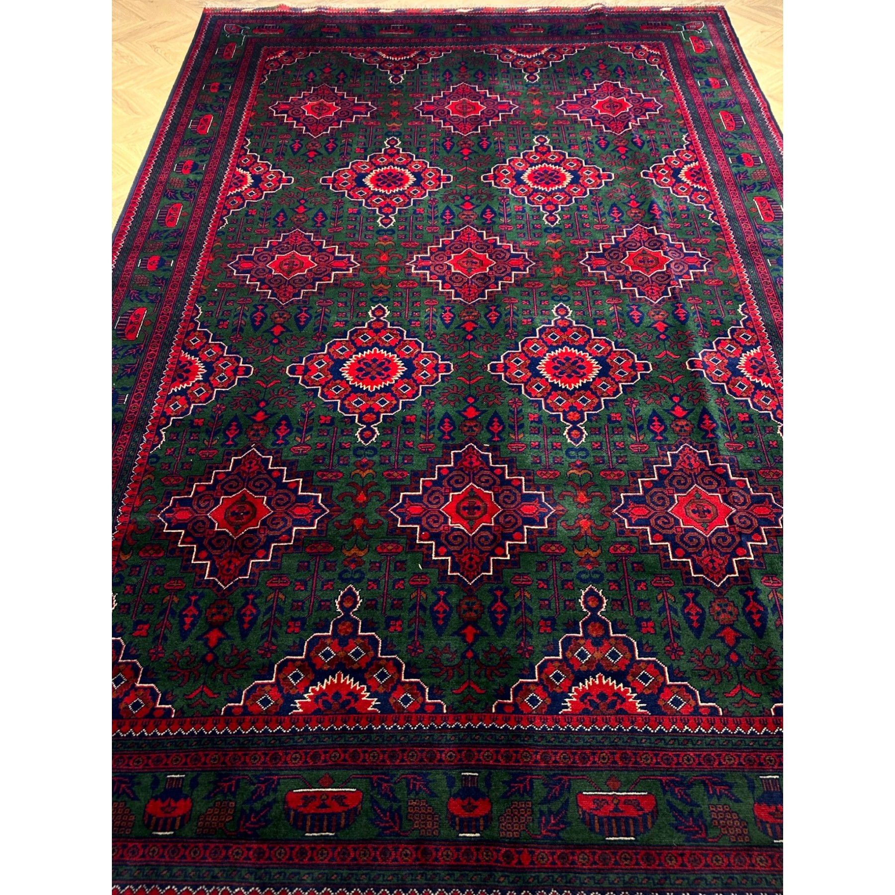 Ten afgański, ręcznie tkany dywan wykonany z wysokiej jakości wełny zachwyca soczystą paletą barw i tradycyjnym wzornictwem regionu. Głębokie zielenie i czerwienie tworzą kompozycję typową dla afgańskich mistrzów tkactwa, którzy od pokoleń przekazują swoje umiejętności, zachowując niezmienną estetykę tego wyjątkowego rzemiosła. Charakterystyczne medaliony i geometryczne układy zdobiące całą powierzchnię nawiązują do dawnych plemiennych motywów, dzięki czemu dywan wnosi do wnętrza atmosferę autentycznej kultury i ponadczasowego piękna. Wełna użyta do wyrobu tego dywanu jest naturalna, sprężysta i trwała, co gwarantuje wieloletnie użytkowanie, miękkość pod stopami i łatwość utrzymania. To dywan, który łączy tradycję z niezwykłą energią koloru i potrafi odmienić każde wnętrze.