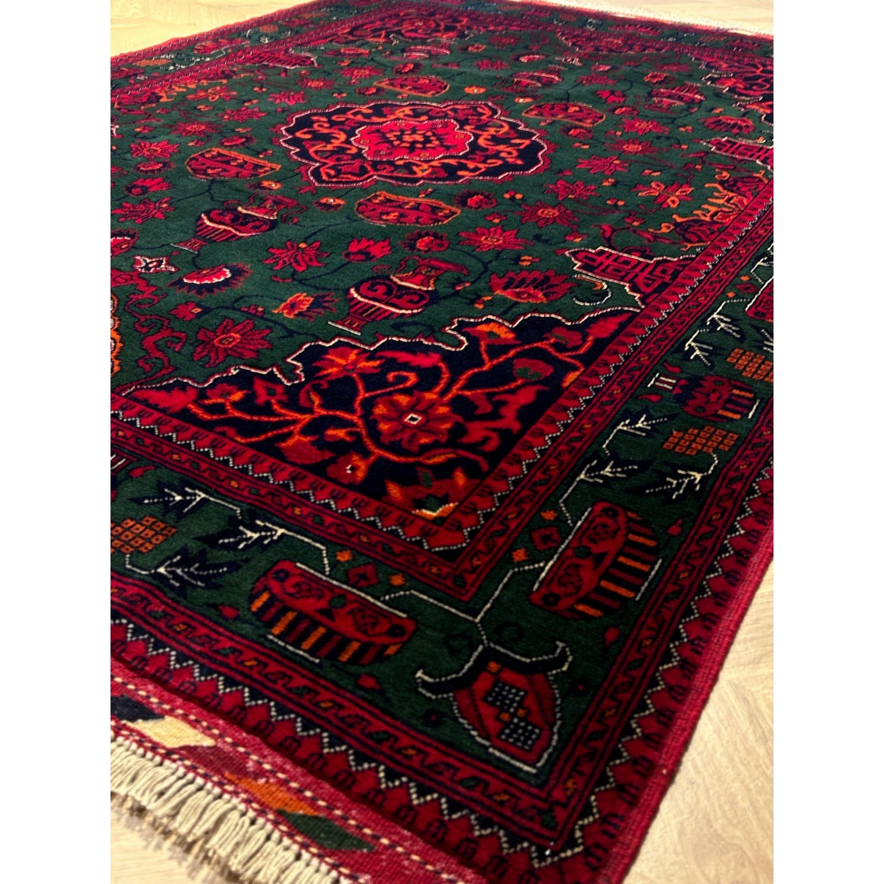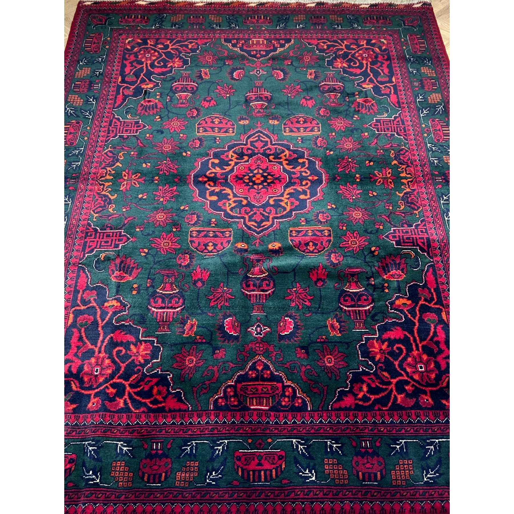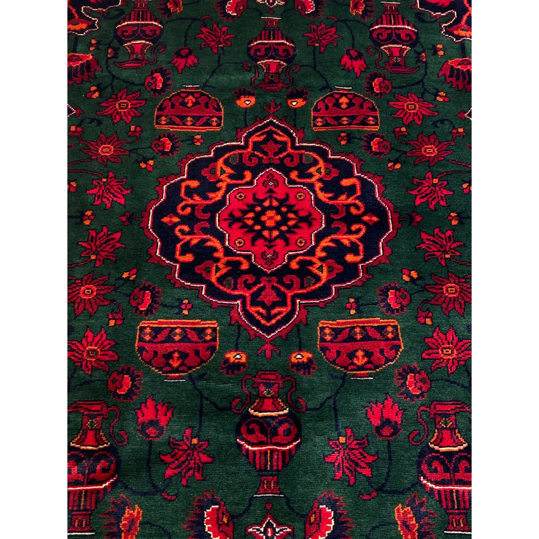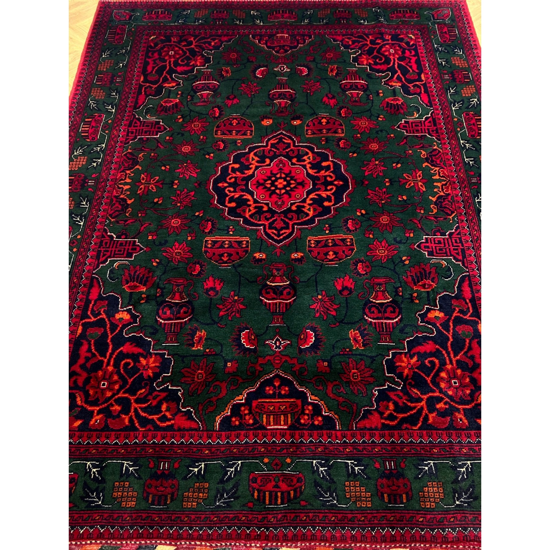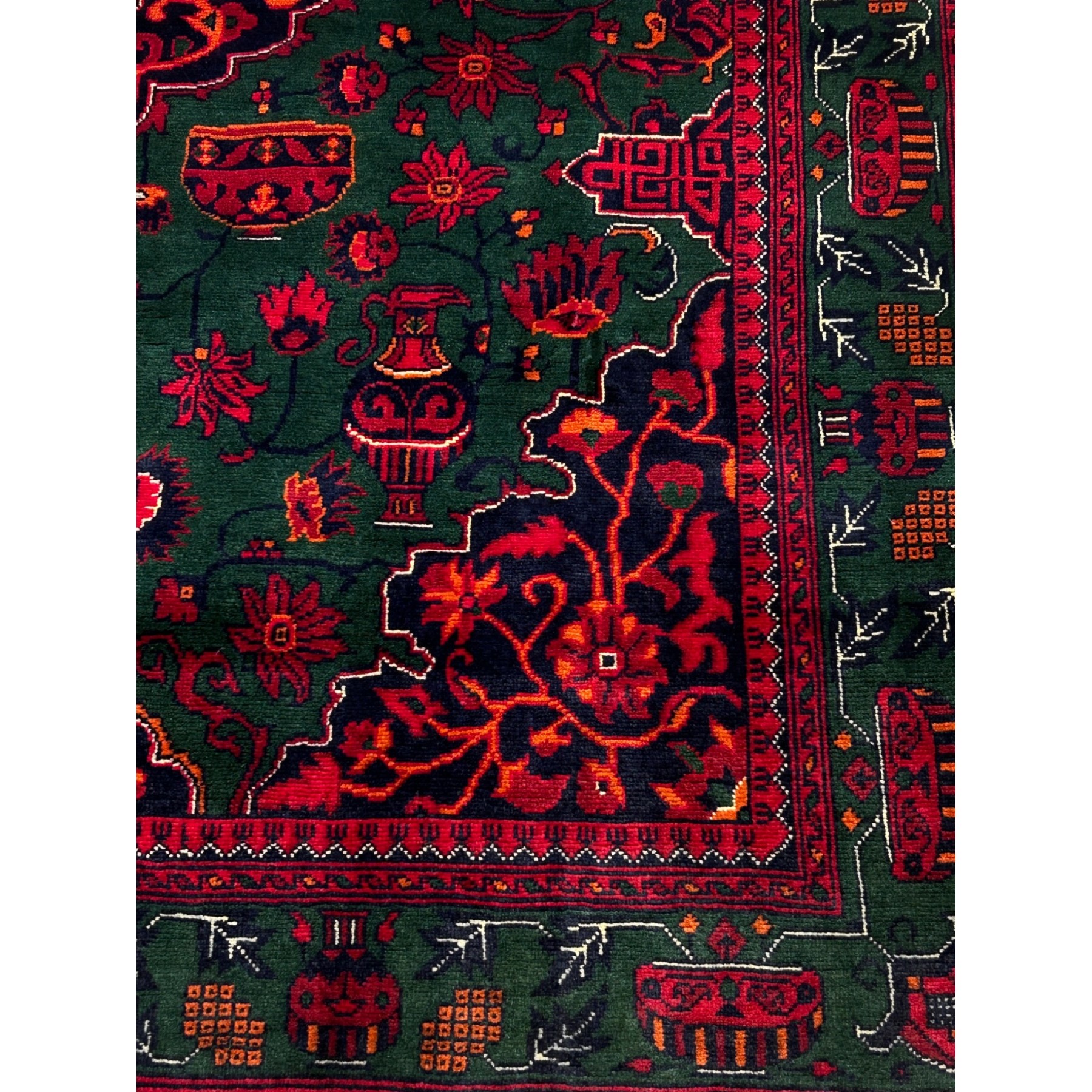 Ten afgański dywan został ręcznie utkany z wysokiej jakości wełny, która nadaje mu naturalną miękkość i wyjątkową trwałość. Jego wzornictwo nawiązuje do tradycji dawnego rzemiosła koczowniczych plemion Afganistanu, gdzie motywy roślinne, naczynia i geometryczne akcenty łączą się w jedną, spójną kompozycję. Głębokie tony czerwieni, zieleni i granatu tworzą charakterystyczny dla tego regionu klimat – intensywny, barwny i pełen energii. Ręczne tkanie sprawia, że każdy element jest dopracowany, a cały dywan emanuje kunsztem i naturalnym urokiem, którego nie da się osiągnąć w produkcji maszynowej. To wyjątkowy wybór do wnętrz, w których liczy się autentyczność, kolor i orientalny charakter.