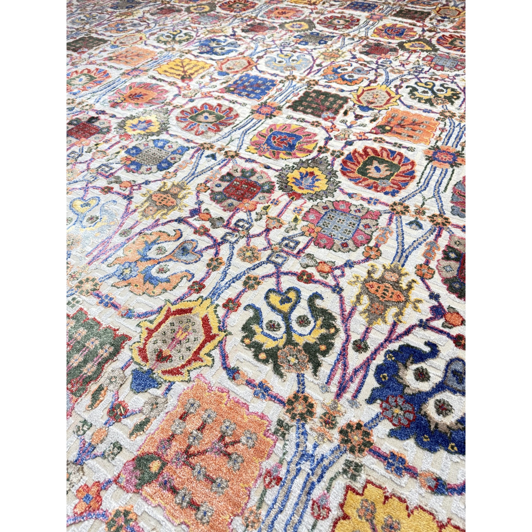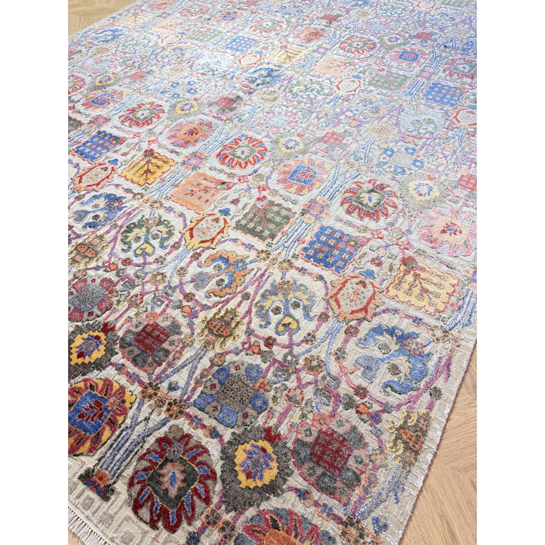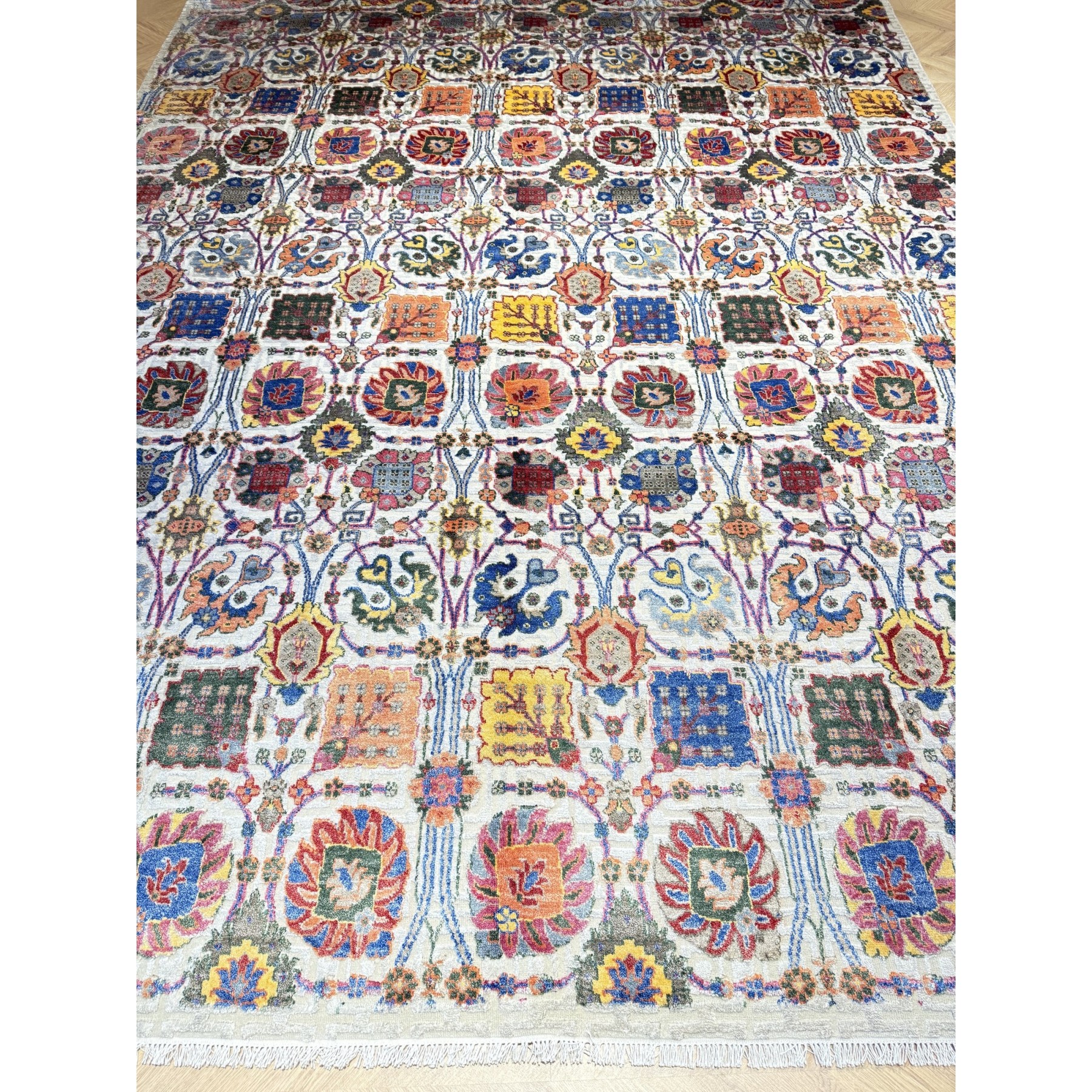 Wzór opiera się na gęstej, powtarzalnej siatce ornamentalnej, w której dominują stylizowane kwiaty, rozety i motywy roślinne. Tego typu kompozycja nawiązuje do klasycznych ogrodów Wschodu — symbolu harmonii, piękna i życia. Jasne tło podkreśla bogactwo detalu i wielobarwność ornamentów, tworząc efekt lekkości mimo bardzo złożonego wzoru.