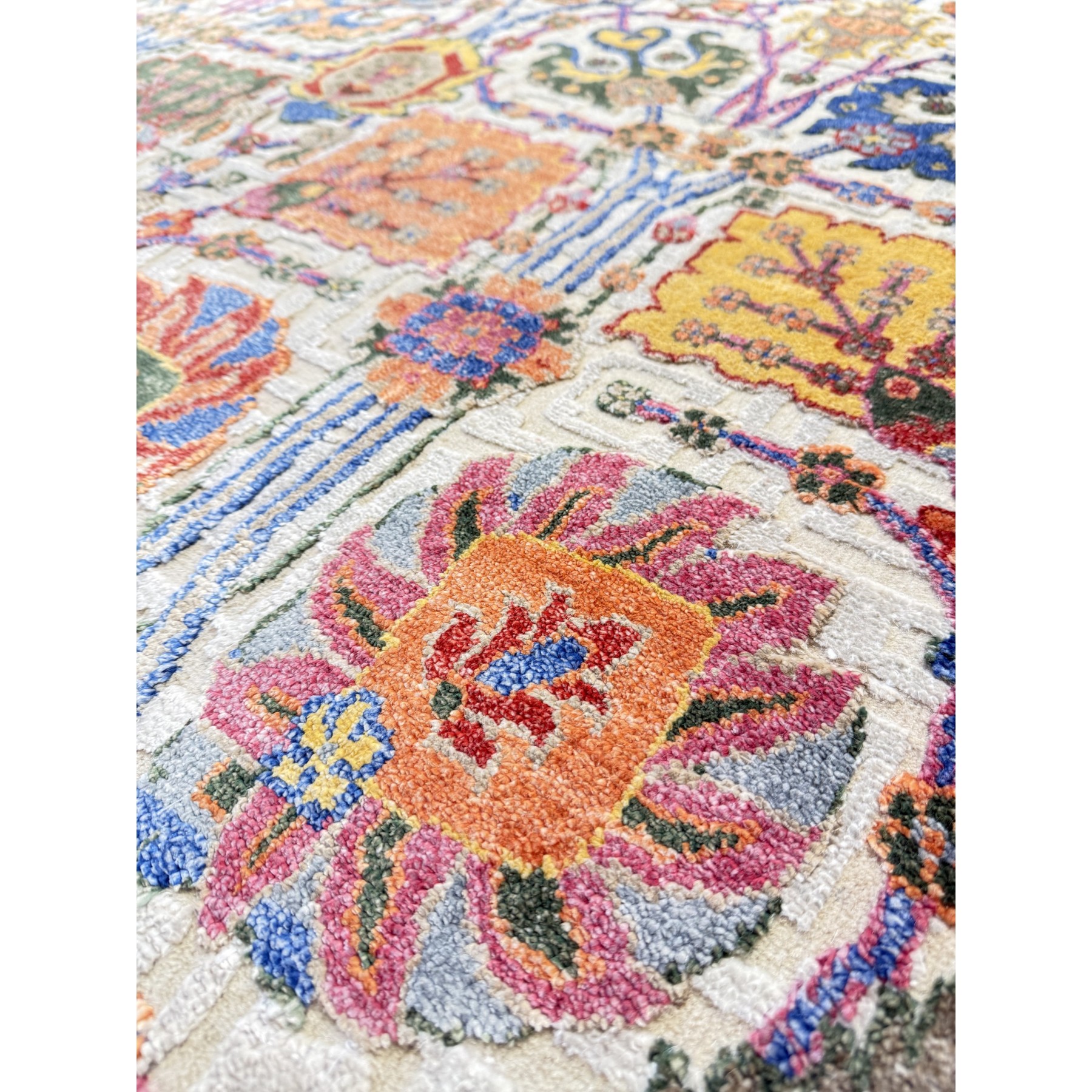 Kolorystyka łączy intensywne akcenty czerwieni, błękitu, żółci, zieleni i różu z neutralną bazą, dzięki czemu dywan doskonale rozjaśnia wnętrze i nadaje mu elegancki, dekoracyjny charakter. To model idealny zarówno do klasycznych salonów, jak i nowoczesnych przestrzeni, gdzie stanie się wyrazistym elementem aranżacji.