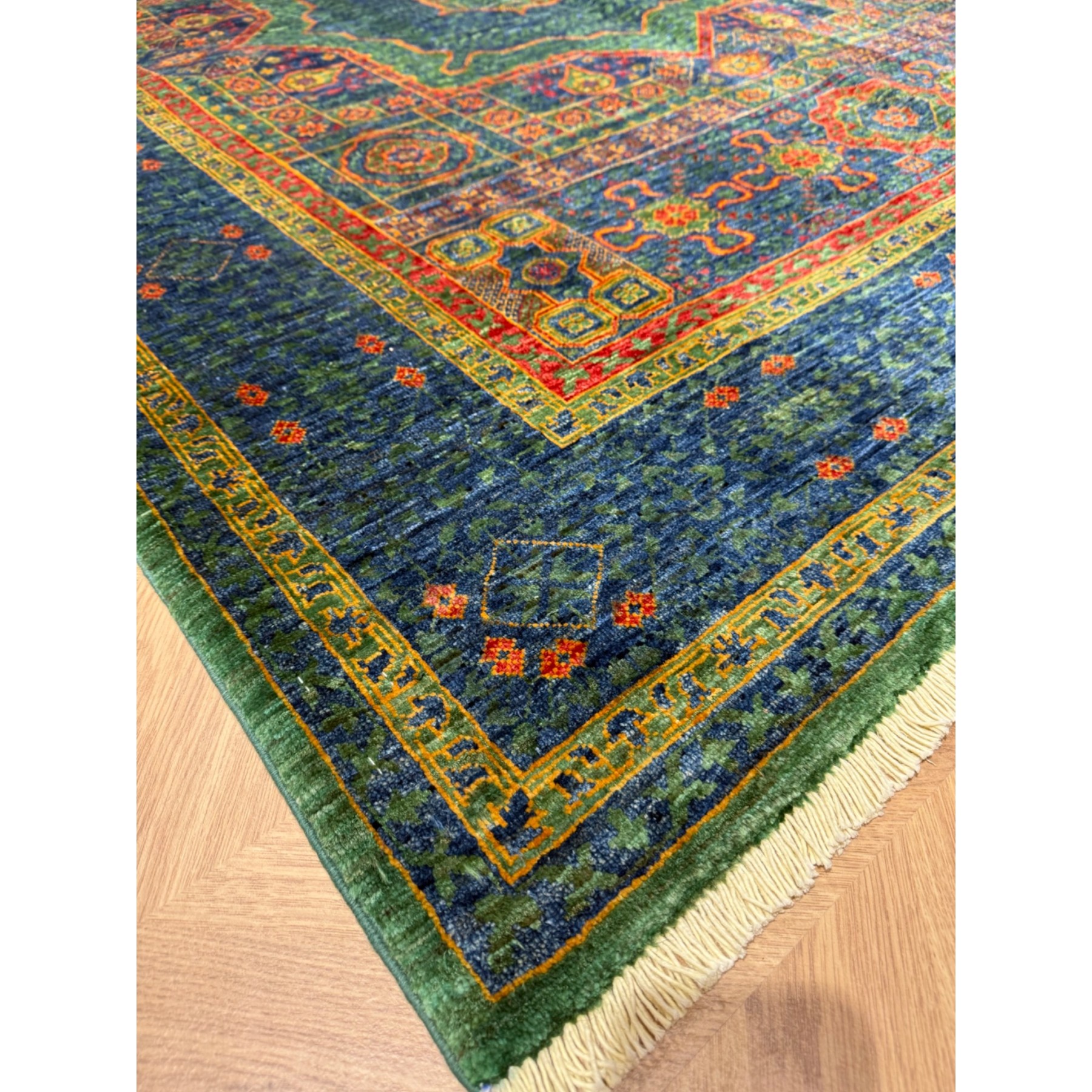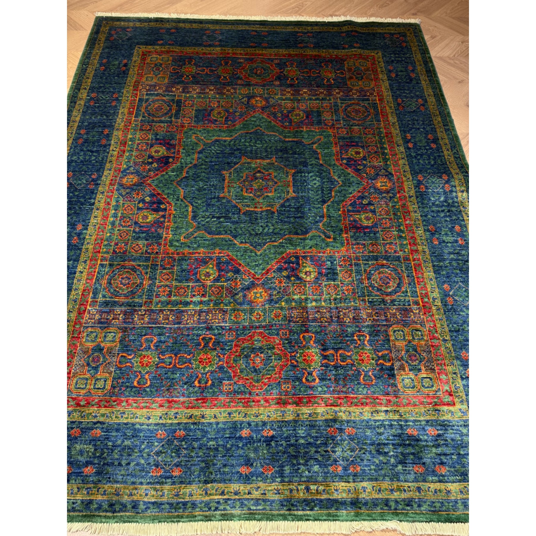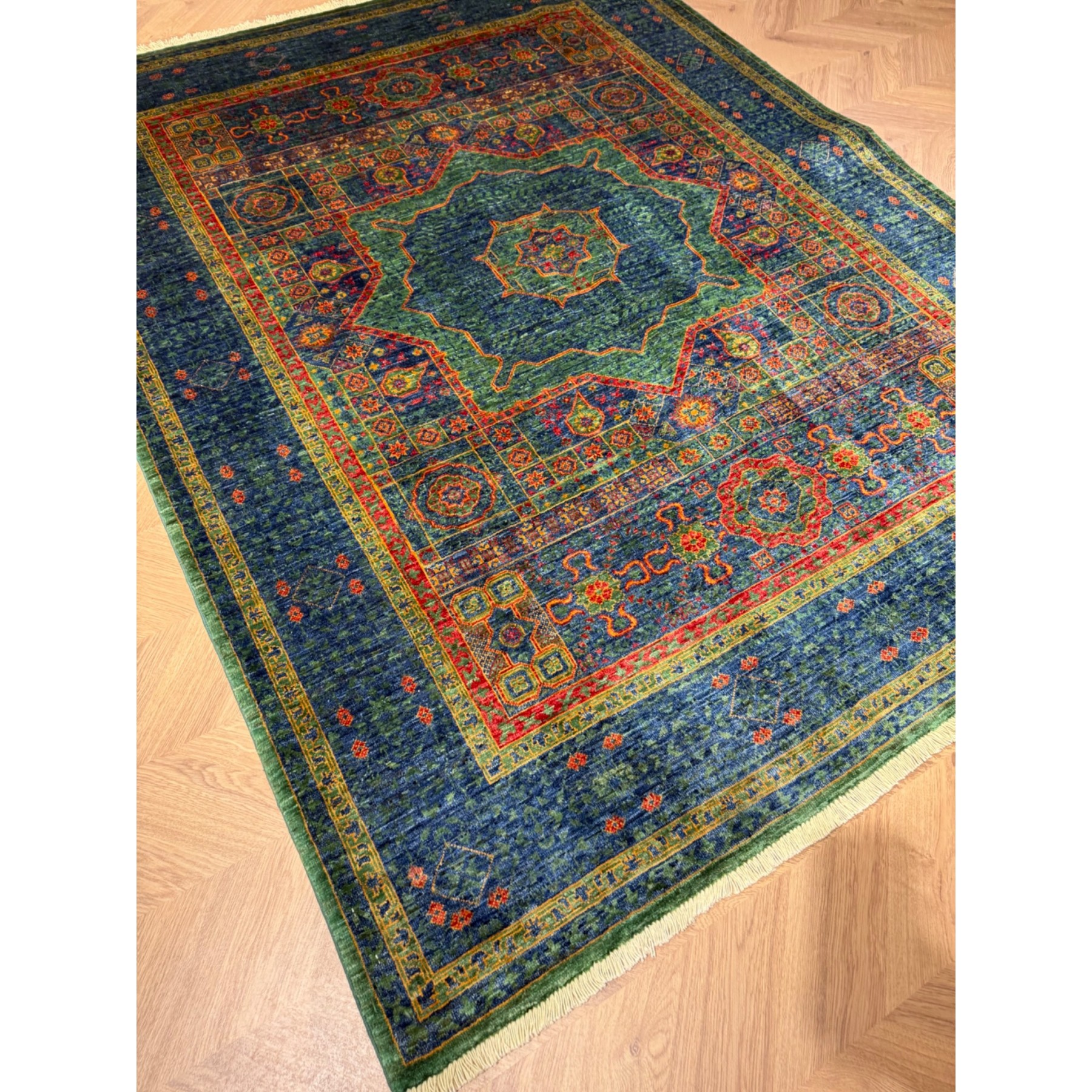 Ten wyjątkowy dywan pakistański typu Mamluk wyróżnia się niezwykle bogatą kompozycją i charakterystyczną symetrią inspirowaną tradycją dawnych dywanów tworzonych na Bliskim Wschodzie. To wzornictwo, znane z historycznych wyrobów z czasów mamluckich, jest cenione za swoją precyzję, geometryczne układy i hipnotyzujący rytm detali. Wykonany został z wysokogatunkowej wełny o jedwabistym połysku, dzięki czemu barwy zyskują głębię, a cała powierzchnia prezentuje się szlachetnie i elegancko. Intensywne odcienie zieleni, błękitu, czerwieni i złota tworzą misterną mozaikę motywów, które nadają dywanowi niezwykły charakter. Każdy fragment dywanu został utkany ręcznie, co podkreśla rzemiosło pakistańskich mistrzów i gwarantuje trwałość na wiele lat. To dywan, który nie tylko zdobi, ale także wprowadza do wnętrza wyjątkową atmosferę, łącząc tradycję z luksusem.