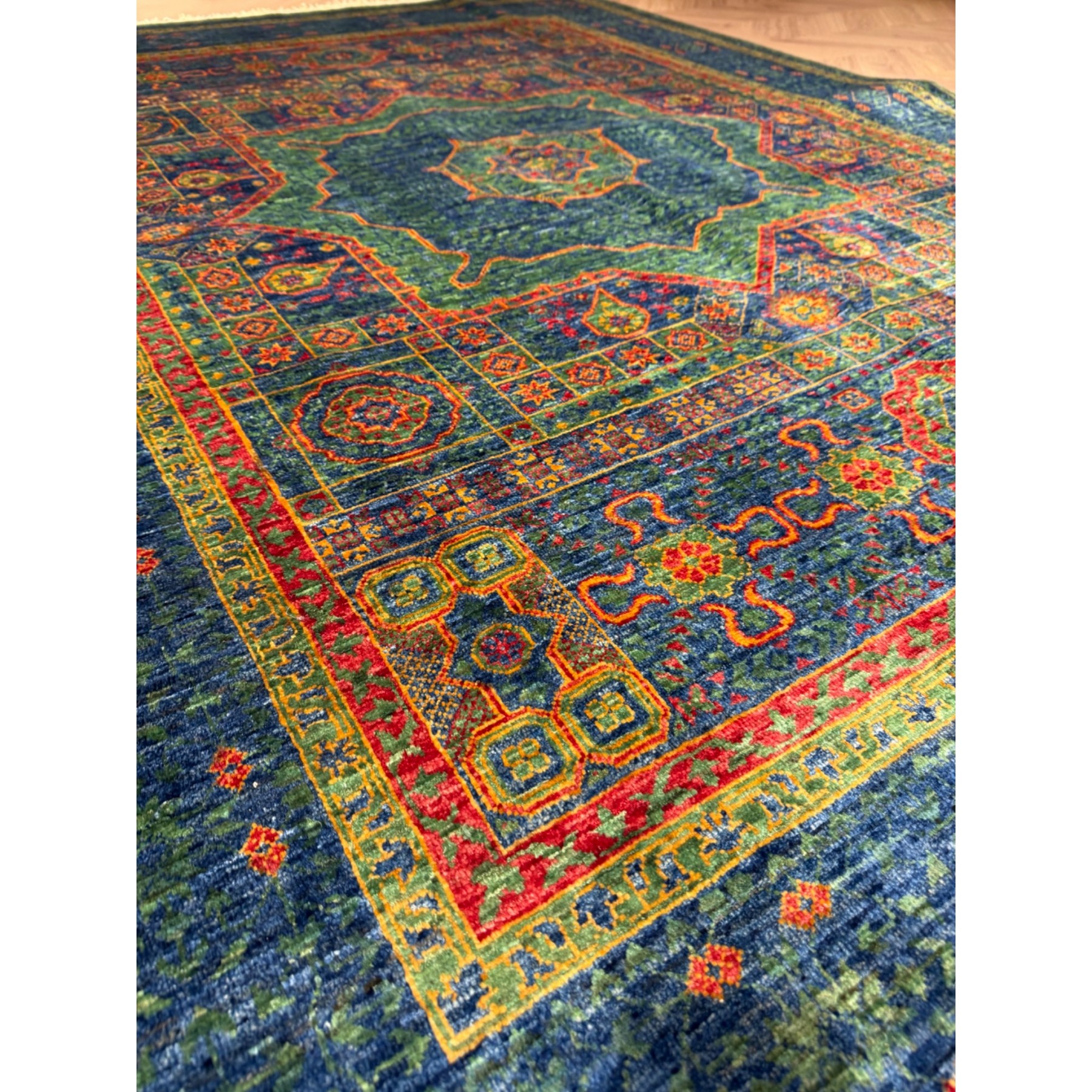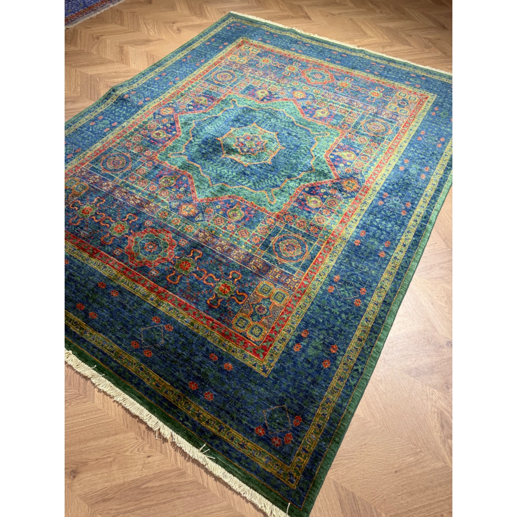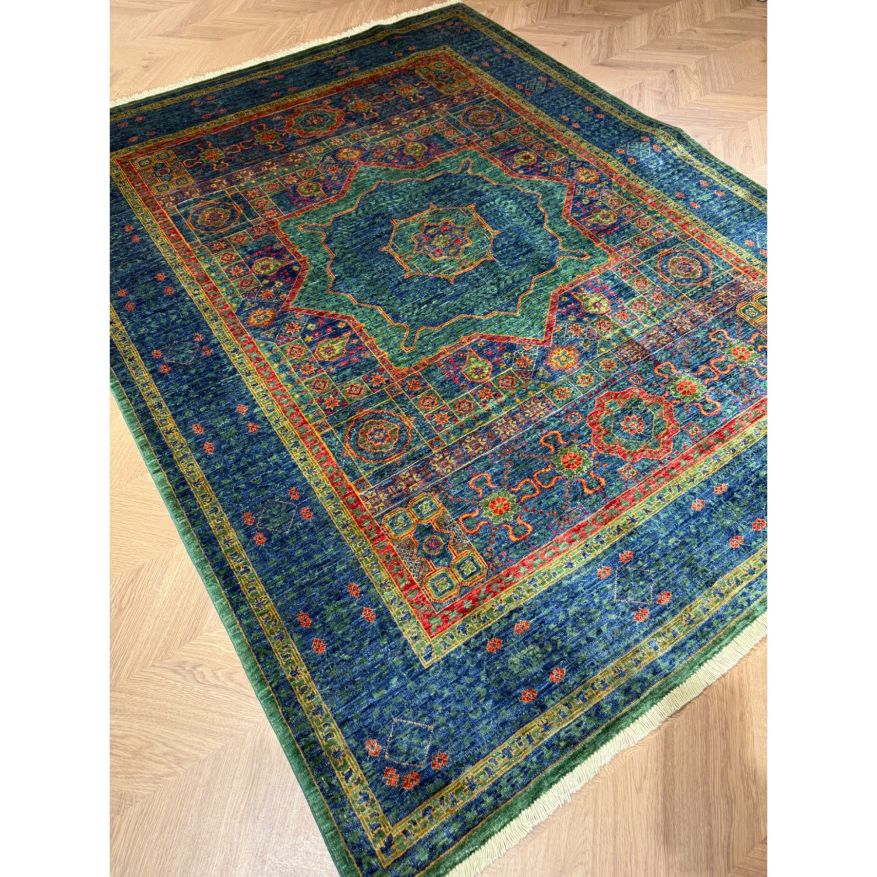 Ten wyjątkowy dywan pakistański typu Mamluk wyróżnia się niezwykle bogatą kompozycją i charakterystyczną symetrią inspirowaną tradycją dawnych dywanów tworzonych na Bliskim Wschodzie. To wzornictwo, znane z historycznych wyrobów z czasów mamluckich, jest cenione za swoją precyzję, geometryczne układy i hipnotyzujący rytm detali. Wykonany został z wysokogatunkowej wełny o jedwabistym połysku, dzięki czemu barwy zyskują głębię, a cała powierzchnia prezentuje się szlachetnie i elegancko. Intensywne odcienie zieleni, błękitu, czerwieni i złota tworzą misterną mozaikę motywów, które nadają dywanowi niezwykły charakter. Każdy fragment dywanu został utkany ręcznie, co podkreśla rzemiosło pakistańskich mistrzów i gwarantuje trwałość na wiele lat. To dywan, który nie tylko zdobi, ale także wprowadza do wnętrza wyjątkową atmosferę, łącząc tradycję z luksusem.